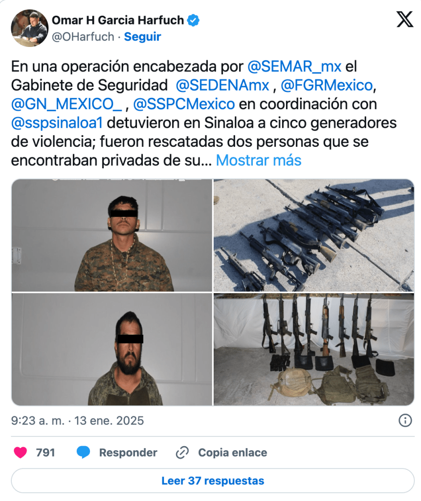 CDMX.-Omar García Harfuch, titular de la Secretaria de Seguridad y Protección Ciudadana (SSPC), detall´po que fueron detenidos cinco generadores de violencia en Mazatlán, Sinaloa, en una operación encabezada por el Gabinete de Seguridad federal.