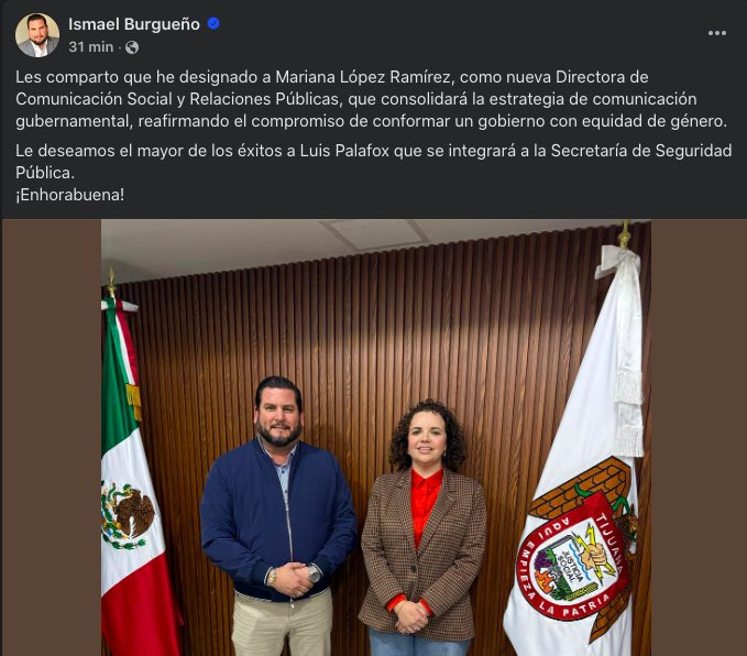 Tijuana, Baja California.- El Alcalde de Tijuana, Ismael Burgueño Ruiz anunció el cambio de titularidad en la Dirección de Comunicación y Relaciones Públicas del XXV Ayuntamiento de Tijuana a través de sus redes sociales, y presentó a Mariana López Ramírez como la nueva responsable de dicha dependencia.