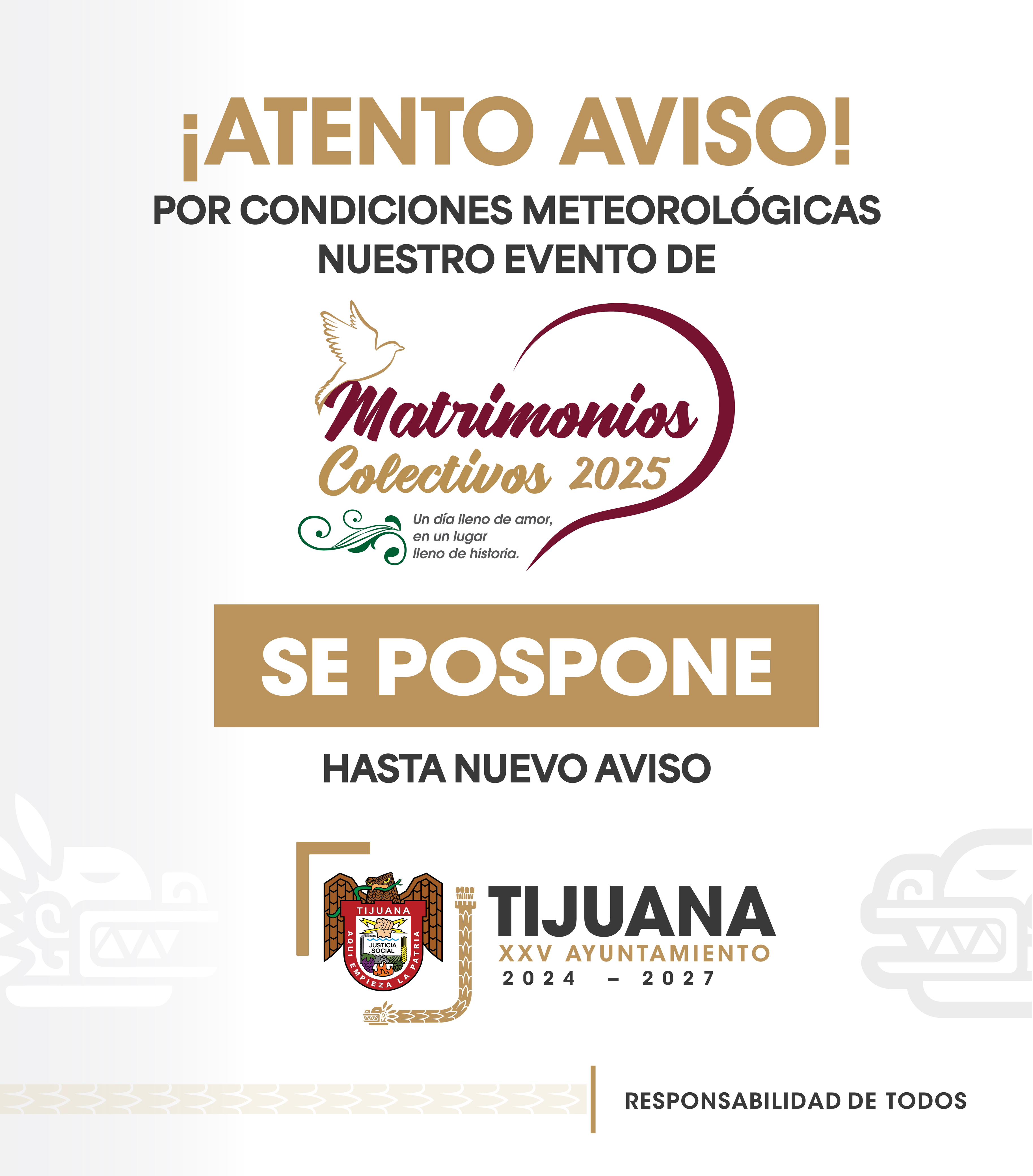Tijuana, Baja California, 11 de febrero de 2025. El XXV Ayuntamiento de Tijuana, a través de la Oficialía de Registro Civil, informa que ante la llegada de fuertes lluvias a la región, se determinó la suspensión indefinida de la Ceremonia de Matrimonios Colectivos, como una instrucción precisa del presidente municipal, Ismael Burgueño Ruiz, de salvaguardar y proteger la integridad de las y los asistentes a dicho evento,