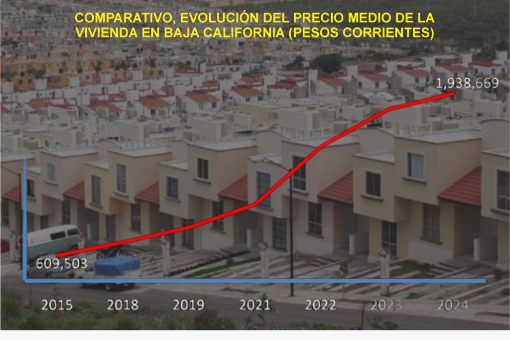 TIJUANA.- (24 de Febrero/25) Con un incremento del 218%, el precio de la vivienda en Baja California alcanzó su mayor nivel en una década, al cierre del 2024, al pasar de 609 mil 503 pesos el precio promedio de una casa de interés social, a 1 millón 938 mil 669 pesos, dijo Luis Roberto Valero Berrospe, presidente del Centro de Estudios Económicos de la entidad.