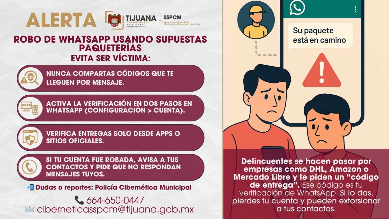 Tijuana, B.C., a 22 de abril del 2025. La Secretaría de Seguridad y Protección Ciudadana Municipal (SSPCM), a través de la Policía Cibernética, alerta a las y los tijuanenses sobre una modalidad de fraude digital en la que delincuentes suplantan a empresas de paquetería reconocidas como Amazon, Mercado Libre o DHL para robar cuentas de WhatsApp.