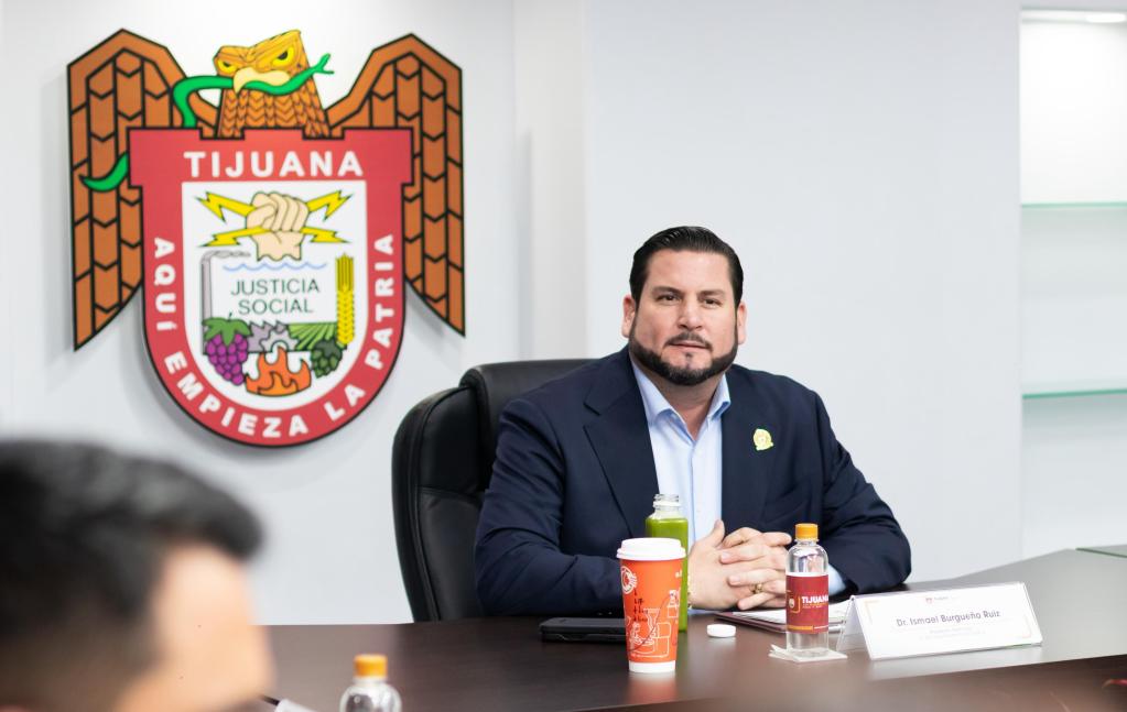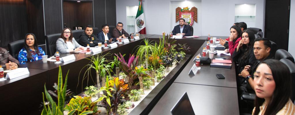 Tijuana, Baja California, a 8 de mayo de 2025. En seguimiento a la Estrategia Nacional de Seguridad impulsada por la presidenta de la República, Claudia Sheinbaum Pardo, el alcalde de Tijuana, Ismael Burgueño Ruiz, sostuvo una reunión de trabajo con la titular del Centro Nacional de Prevención del Delito y Participación Ciudadana, Beatriz Adriana Olivares Pinal, así como con integrantes del Gabinete Municipal, con el propósito de avanzar en la implementación de la estrategia integral en las Zonas de Paz del norte y centro de esta ciudad.