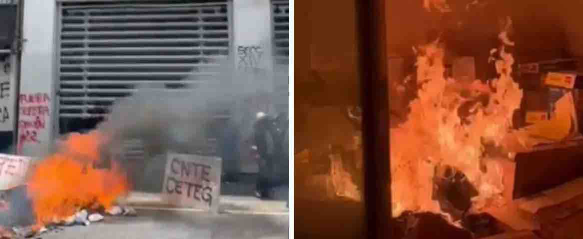 En tanto, continuó la quema de objetos extraídos del interior del inmueble como sillas, bocinas, gorras, camisetas, cajas cartón, botes de basura e imágenes del líder nacional del SNTE, Alfonso Cepeda Salas.