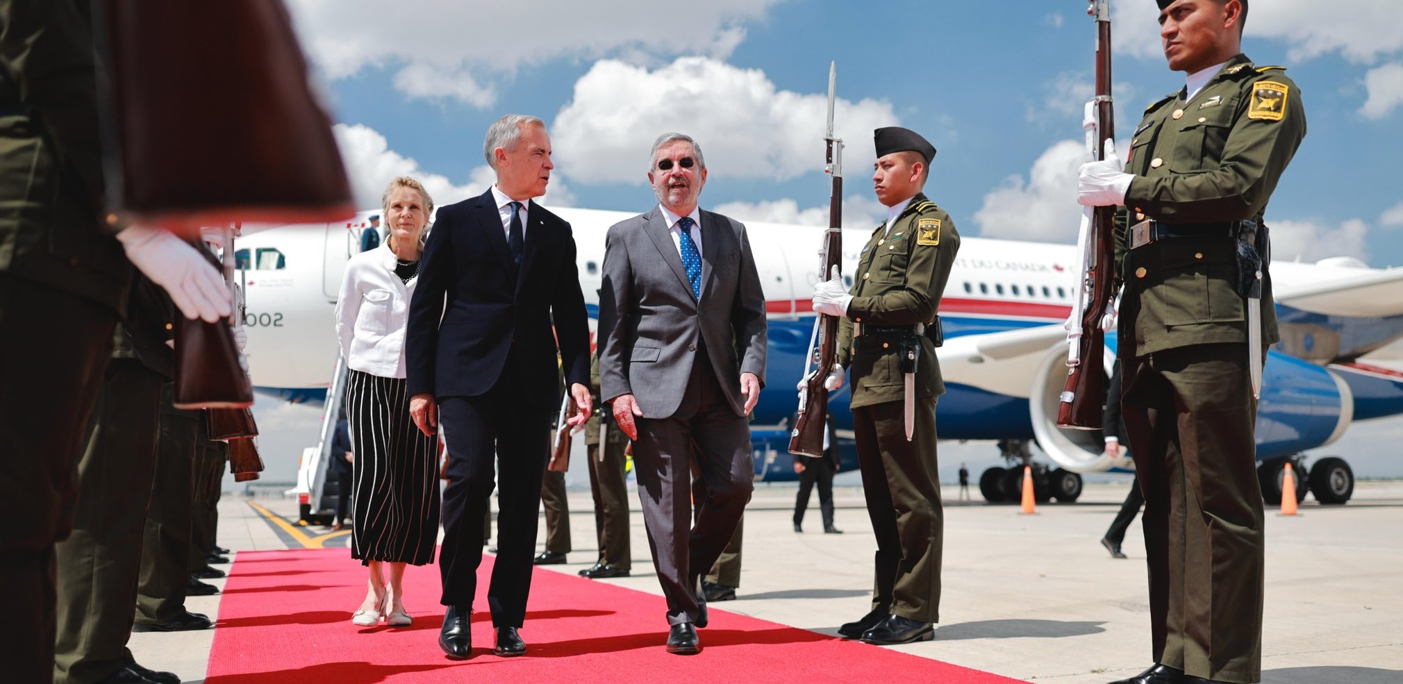 Carney y su comitiva llegaron poco antes de las 11:00 h al Aeropuerto Internacional Felipe Ángeles (AIFA), siendo recibido por el canciller Juan Ramón de la Fuente.